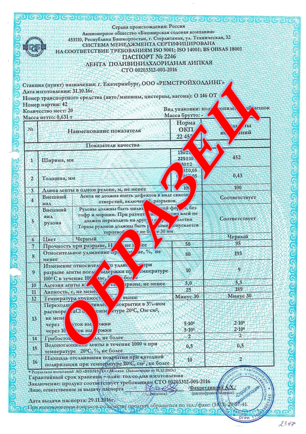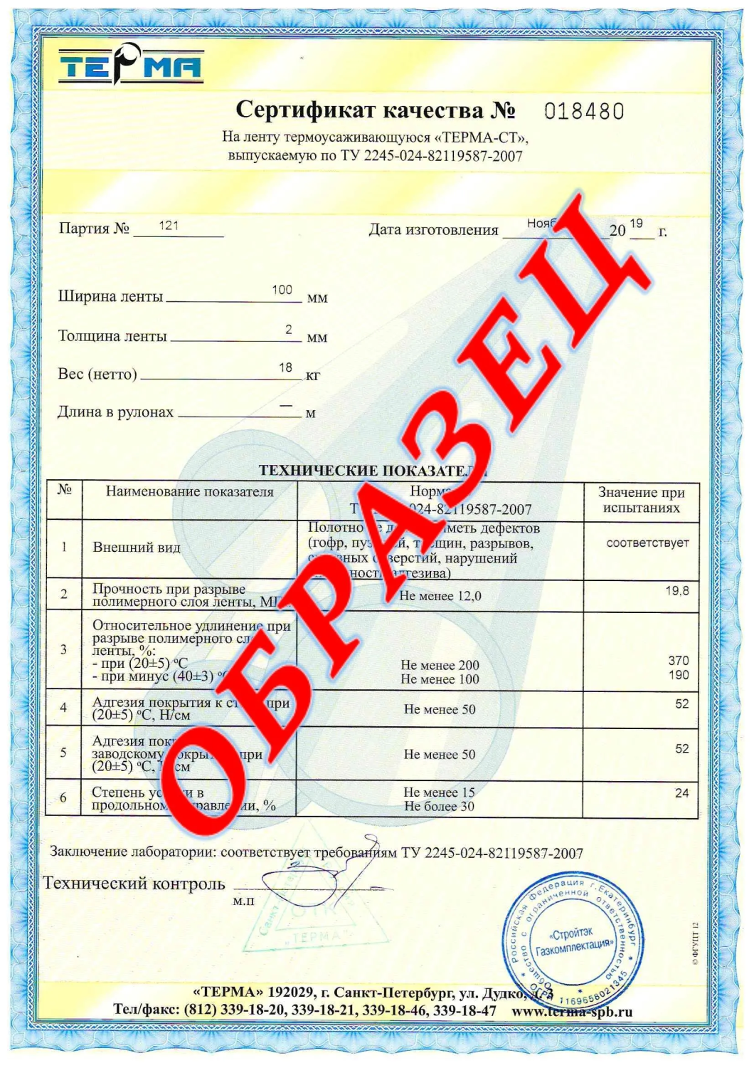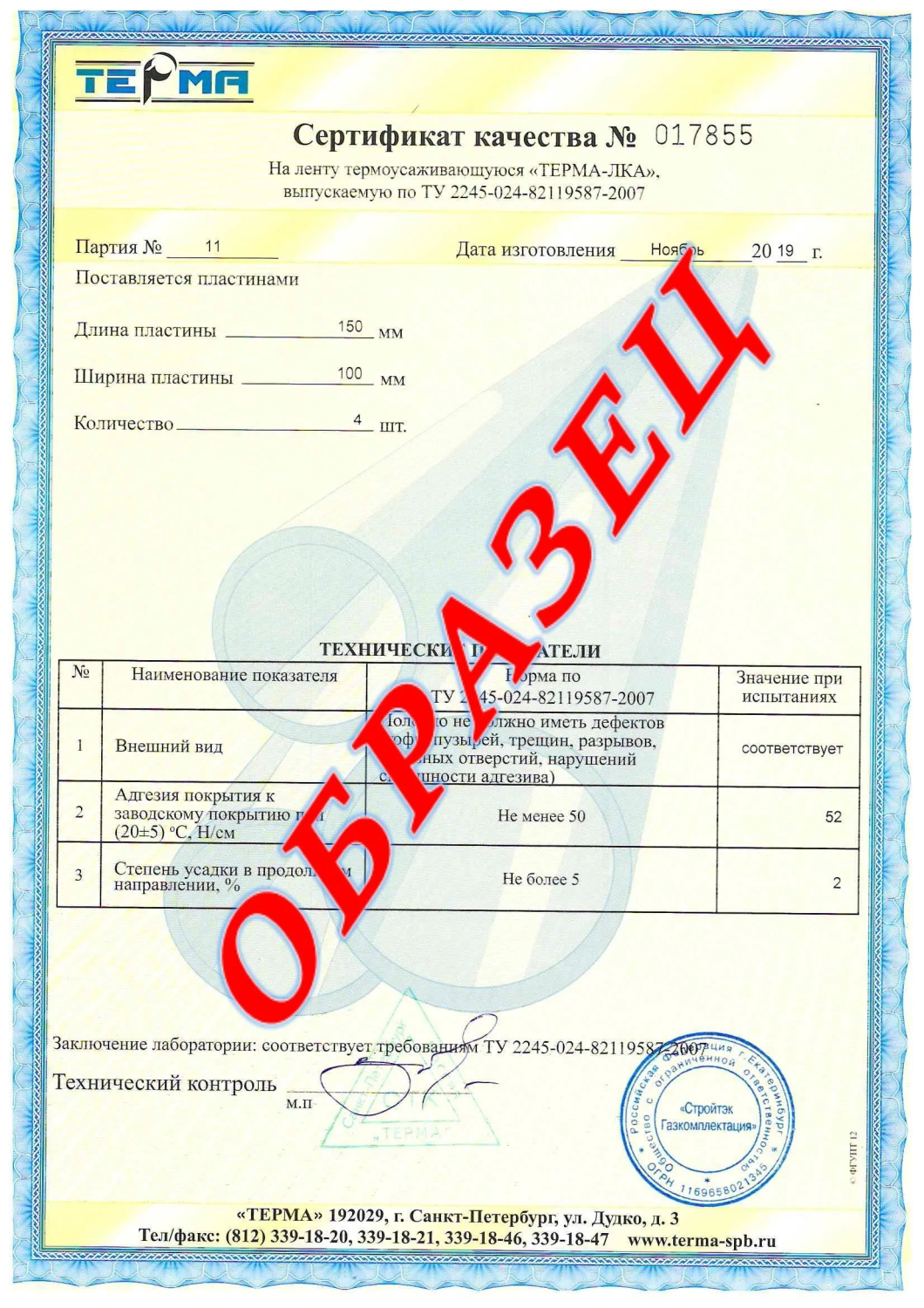 Сертификат качества на ленту термоусаживающуюся "ТЕРМА-СТ"
