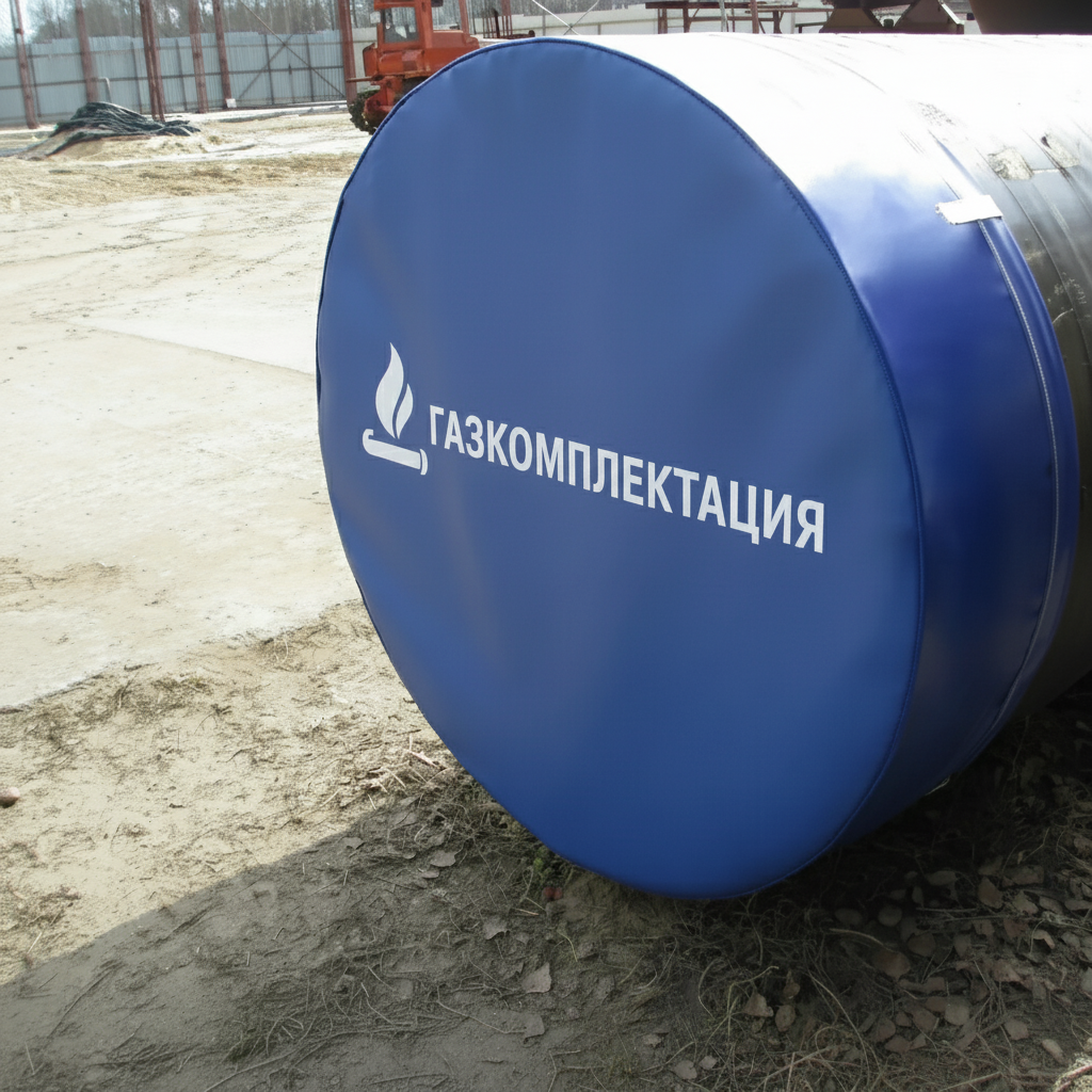 Транспортная заглушка для труб представляет собой тканевую, шитую, плоскую конструкцию с загибом (полями) от 100 до 300 мм (в зависимости от диаметра) со стяжным синтетическим ремнем и фиксирующим устройством для закрепления заглушки, одеваемой на торцевую часть трубы.