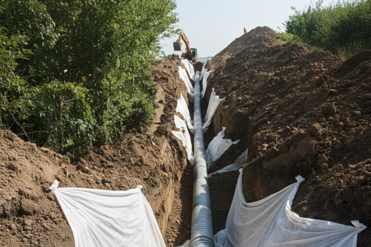 Противоэрозионное полотенце (ПП) предназначено для защиты от вымывания грунта (выноса грунта засыпки) в сечении траншеи при подземной прокладке трубопроводов на улонах микрорельефа.