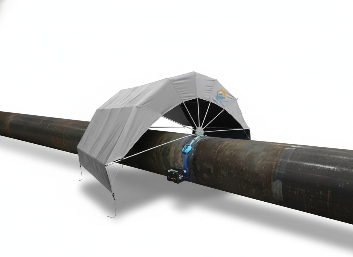 «Сфера 325-1420» - Укрытие для ведения сварочных, изолировочных и диагностических работ на трубопроводах диаметром 325-1420 мм (сборно-разборный каркас, тент из ткани МВО с огнеупорной пропиткой "Proban"), габ.разм. ширина/высота над тр./длина вдоль трубы, мм: 4000/1400/2500