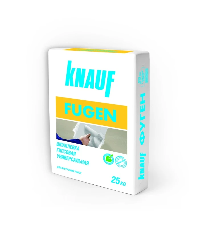 Сухая шпаклевочная смесь на основе гипса с полимерными добавками. Шпаклевка гипсовая КНАУФ-Фуген разработана специально для заделки стыков гипсокартонных КНАУФ-листов (ГКЛ). Не трескается и не дает усадки. Материал изготовлен из экологически чистого природного минерала (гипса) и не содержит вредных для здоровья человека веществ. Предназначена для: •заделки стыков гипсокартонных КНАУФ-листов (ГКЛ), имеющих утонённую и полукруглую утонённую кромку, с использованием армирующей ленты; •заделки трещин и других возможных повреждений гипсокартонных КНАУФ-листов (ГКЛ); •тонкослойного шпаклевания плоских бетонных и оштукатуренных поверхностей; •заполнения стыков сборных бетонных элементов; •монтажа и заделки стыков гипсовых пазогребневых плит; •приклеивания к ровной поверхности гипсокартонных листов и комбинированных панелей; •склеивания и шпаклевания гипсовых элементов; •для внутренних работ. Подготовка поверхности Поверхность листов должна быть очищена от грязи и пыли и обработана грунтовкой глубокого проникновения. Приготовление Смесь засыпать в ёмкость с чистой холодной водой (1 кг смеси примерно на 0,8), равномерно распределяя по поверхности. Выдержать 2-3 минуты и перемешать шпателем до получения однородной сметанообразной массы. Замес производить только вручную. Порядок работ Время от начала затворения водой сухой смеси до начала схватывания составляет примерно 30 минут. Минимально допустимая температура в помещении +10 С. После высыхания зашпатлёванная поверхность подлежит шлифованию. Под отделочные покрытия вся поверхность листов подлежит грунтованию. •при заделке стыков ГКЛ на 1м2  0,25 кг •при сплошном шпаклевании, на каждый 1 мм на м2  0,8 кг Толщина слоя-1-3 мм Размер фракции не более 0,15 мм Прочность сжатие-3,0 МПа, изгиб 1,5 МПа В машине  16 палет