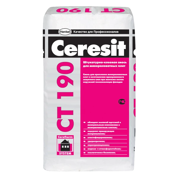 В машине  16 палет Смесь для крепления минераловатных плит и создания базового штукатурного слоя при наружной теплоизоляции фасадов Расход  6,кг /м2 Свойства • обладает высокой адгезией; • содержит армирующие микроволокна; • эластифицированная; • ударопрочная; • паропроницаемая; • морозо- и атмосферостойкая; • экологически безопасна. Область применения Штукатурно-клеевая смесь CT 190 предназначена для крепления минераловатных теплоизоляционных плит на минеральных основаниях и создания на них базового штукатурного слоя, армированного стеклосеткой, при устройстве систем наружной теплоизоляции фасадов Ceresit WM.