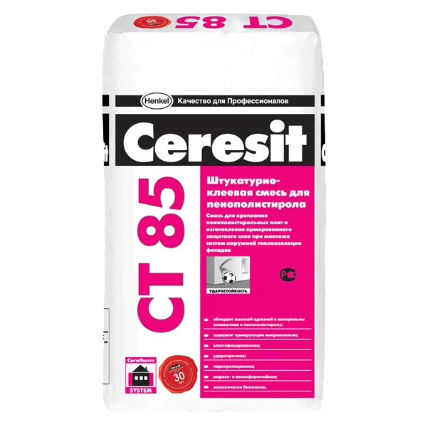 В машине  16 палет Смесь для крепления плит из пенополистирола и создания базового штукатурного слоя при наружной теплоизоляции фасадов Расход 6 кг /м2 Штукатурно-клеевая смесь Свойства • выпускается в «зимней» и «летней» версиях для работы в различных климатических условиях; • обладает высокой адгезией; • содержит армирующие микроволокна; • эластифицированная; • ударопрочная; • паропроницаемая; • морозо- и атмосферостойкая; • экологически безопасна. Область применения Штукатурно-клеевая смесь CT 85 предназначена для крепления теплоизоляционных плит из пенополистирола, а также противопожарных рассечек из минераловатных плит, на минеральных основаниях и создания на них базового штукатурного слоя, армированного стеклосеткой, при устройстве систем наружной теплоизоляции фасадов Ceresit VWS.