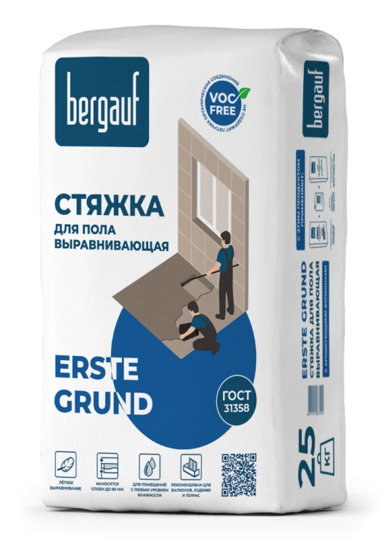 Bergauf Erste Grund, Выравнивающая стяжка для пола Тип основания              Монолитный бетон, железобетонная плита перекрытия     Черновая (базовая) стяжка      Сфера работ              Помещения с нормальной влажностью     Помещения с повышенной влажностью (ванная)     Бассейн     Наружные работы*     Характеристики продукта              Цвет    Серый Максимальная фракция песка    до 4,5 мм Характеристики применения              Расход сухой смеси на 1 кв. м при слое 10 мм    18-20 кг Минимальная толщина слоя    10 мм Максимальная толщина слоя    80 мм Максимальная толщина слоя при частичном выравнивании    90 мм Жизнеспособность готового раствора в открытой таре    Не менее 30 мин Характеристики эксплуатации              Прочность на сжатие (через 28 суток)    Не менее 20 МПа Прочность на изгиб (через 28 суток)    Не менее 2,5 МПа Прочность сцепления с основанием (через 28 суток)    Не менее 0,4 МПа Морозостойкость    F 50 Температура эксплуатации    от -50 до +70°С Характеристики применения при наружных работах              Частичная нагрузка (можно ходить) через    24 часа* Укладка напольных покрытий (в зависимости от типа покрытия)    от 5 суток* Время полного набора прочности    28 суток Проведение работ при температуре основания    от +5 до +25°С